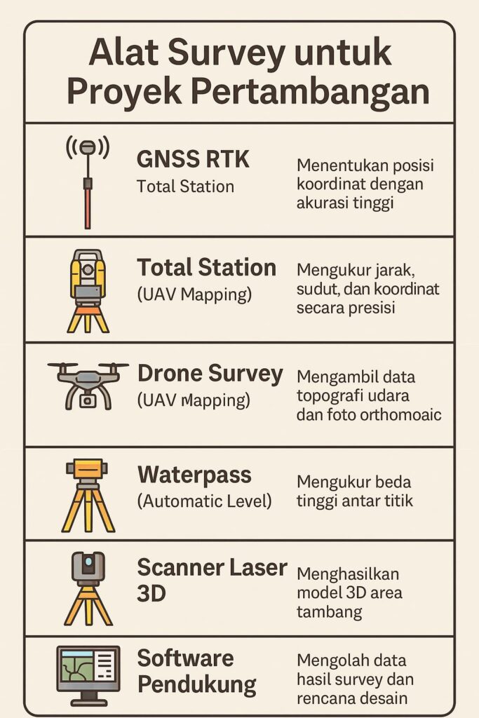 Dengan kombinasi alat yang tepat seperti GNSS RTK, drone, total station, dan software pendukung, sebuah proyek tambang dapat berjalan lebih efisien, akurat, dan aman.