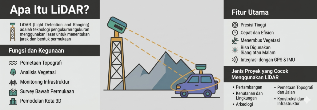 Teknologi pemetaan dan survei semakin canggih dari waktu ke waktu, dan salah satu inovasi terpenting dalam beberapa tahun terakhir adalah LiDAR (Light Detection and Ranging). Namun, tidak semua orang memahami apa itu LiDAR, fungsinya, serta kapan sebaiknya teknologi ini digunakan agar tepat guna dan efisien.